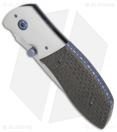 This Custom Mathor folding knife from Aaron Frederick offers a solid EDC design with lightning strike carbon fiber scales and nickel bolsters over sturdy titanium liners and a blue anodized titanium backspacer. The CPM-154 stainless steel drop point blade is hand finished and expertly sharpened. Comes fitted with a titanium pocket clip for secure carry.