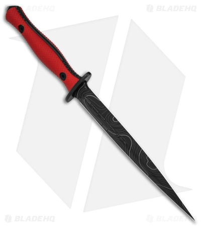 - Red G-10 handle scales over a full tang.