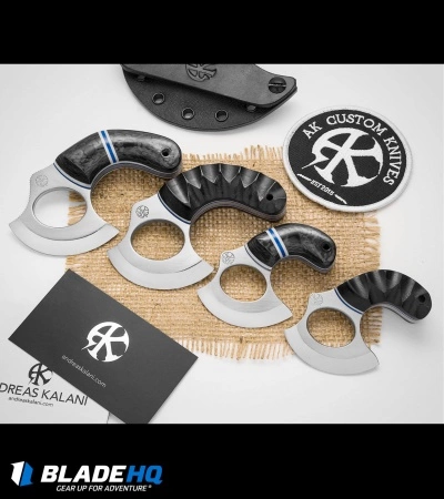 The Floki by Andreas Kalani of AK Custom Knives is similar to the Loki, but with more meat on its bones. This robust tool features a thick, full-tang blade made from high carbon 80CRV2 steel with jimping on the thumb ramp for added security. It comes paired with broad handle scales for a comfortable, full grip. Its versatile build allows a variety of grips to adapt to the task at hand. The Floki includes a secure black Kydex sheath with a leather belt loop attachment for easy carry.