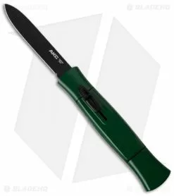 This model is outfitted with a black finished, flat ground spear point blade and a dark green aluminum handle.