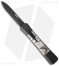 This model is equipped with a black finished, double-edge dagger blade, and a black aluminum handle with a faux gray snake skin insert.