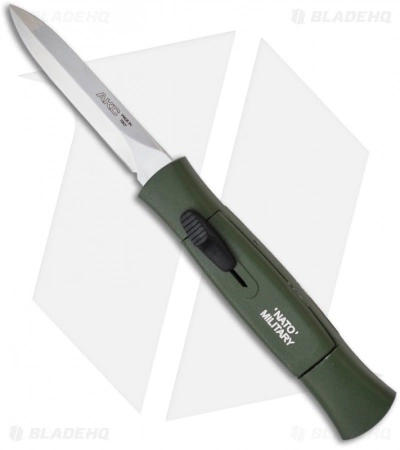 This model features a satin finished dagger blade and a NATO military green aluminum handle.