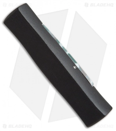 This model features a black finished, flat ground spear point blade and a black aluminum handle with an Arctic Camo acrylic insert.