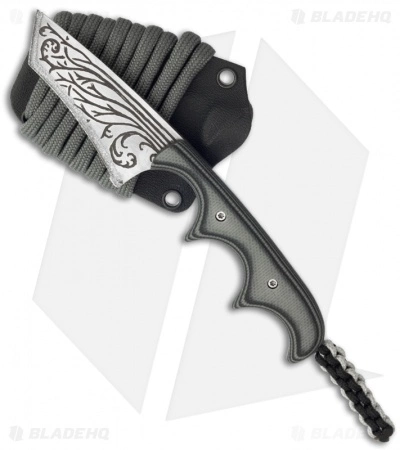 The Alan Folts Minimalist is a compact carry neck knife with notably deep finger grooves that provide excellent grip, comfort and safety. This custom titanium knife features a hand engraved and colored blade along with contoured black/gray G10 scales. The recurved tanto blade is chisel ground with a carbide edge. Includes lanyard, Kydex sheath and neck cord. Pictured above is the actual knife for sale.