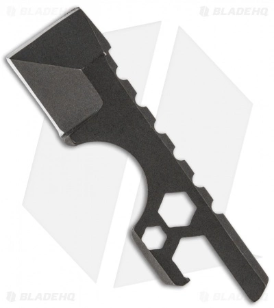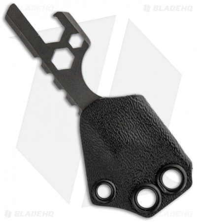 The Bottle Defense Tool (BDT) is a pocket-sized knife with hex cutouts and a bottle opener. The ridges on the spine along with the deep index finger groove provide a sturdy grip. The S35VN steel is Bos heat treated and then stonewashed. The Kydex sheath is perfect for neck carry or attachment to your keychain. This one is black.