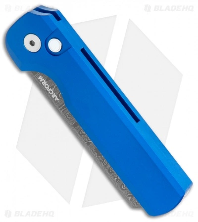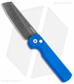 This Slimfoot Auto has a blue anodized aluminum handle and a Chad Nichols Virus Damascus blade.