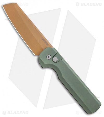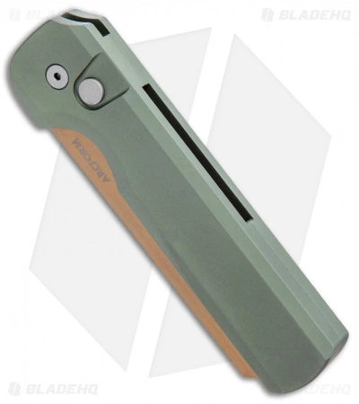 This Blade HQ Exclusive Slimfoot Auto Desert Warrior finish has an OD green anodized aluminum handle and a copper finished blade.