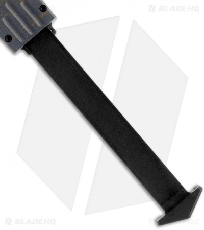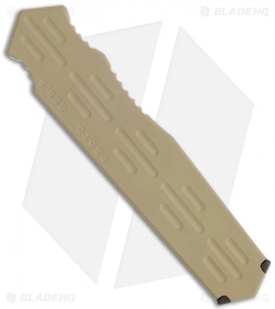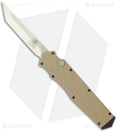 This is the 3rd Generation OTF from Alex Shunnarah of A.R.S. Knives. This single action out-the-front automatic knife features strong, precise action and the tightest lockup we’ve seen in an OTF. The desert tan Cerakote gun finished aluminum handle is super thin with grooves along the faces. The stainless steel tanto blade is polished and is retracted using the pull bar, a great new feature on this OTF knife. Pictured above is the actual knife for sale.