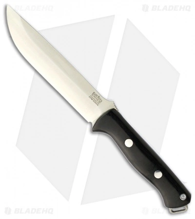 This Bark River Bravo 1.5 has an S35-VN stainless steel blade and a black canvas Micarta handle. Includes leather sheath.