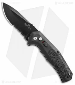 This Bear Ops AC-600 model sports a black GFN handle and a black blade with a partially serrated edge. The AC-600 series offers a compact automatic folding knife for everyday use and carry. A sliding safety on the front of the handle allows for safe carry and convenient blade activation. The GFN handle scales are set over stainless steel liners and textured for tactile grip. A stainless steel pocket clip completes the solid EDC package.