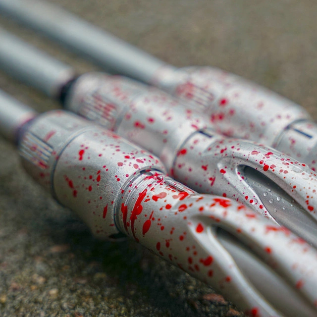 Bite of Bleak Sweet Stick Silver Fang on saatavana kolmessa eri mallissa, joissa on erilaisia toimintoja eri kalastustyyleihin ja kalastusmenetelmiin sopivia vavoja kohtalaisen nopeasta erittäin nopeaan. Vavat erottuvat kolmionmuotoisilla piikeillä, kelan istukan kohdalla olevalla erikoismaalatulla veritahroja muistuttavalla kuvioinnilla ja täyshopeisella terällä. Renkaiden ansiosta sinun ei tarvitse olla huolissasi renkaiden katoamisesta, sillä ne on tuplahitsattu ohjainkehikkoon. ADAMAN™ -pinnoitteella ne saavat myös paremman kulutuskestävyyden ja ruostesuojan. Kolmion muoto vähentää myös kitkaa, kun siima kulkee ohjainkentän läpi, ja se on kevyempi kuin useimmat keraamiset ohjaimet. Kaikkien näiden ainutlaatuisten ominaisuuksien ansiosta se on tarkoitettu niille, jotka haluavat tavallisuudesta poikkeavan vavan!Aihiot Toray 40T Nanometer -teknologiallaEnsimmäinen kolmionmuotoinen spinner: Seaguide DELTA TGY ruostumattomasta teräksestä valmistetulla rengasasennuksella, ADAMAN™ pinnoitteella ja tuplahitsatulla kiinnitykselläTilaustyönä maalattu GAHO-kelan istukka ainutlaatuisella värimaailmalla per sauvaHopeaksi lakattu aihioBite of Bleak Sweetstick Silver Fang FR. 7’4” 4-15 g M-FHopea Fang Finesse -vapa on vapa niille, jotka haluavat vavan, joka kattaa useimmat tekniikat finesse-kalastuksessa. Hieman pehmeämpi aihio tasapainottaa vavan täydellisesti. Huomattavasti herkempi ja pehmeämpi toiminnaltaan kuin esimerkiksi Bite of Bleakin myydyin Bite of Bleak SweetStick 7´6”. Jos siis olet jo pitkään halunnut pehmeämpää SweetStickiä, tämä on se vavan ostos.Kalastustekniikka: Kohtalaisen nopeaPartikkelit: 2Puraisu Bleak Sweetstick Silver Fang NR. 7’0” 3-15g X-FHopea Fang Ned-varsi on Bite of Bleak -vapa, joka on suunniteltu erityisesti Ned-rig-kalastukseen. 7’0” on yksi yleisimmin käytetyistä pituuksista juuri tässä tekniikassa. Täydellisesti tasapainoisen selkävavan ja herkän kärjen ansiosta pystyt liikuttamaan kevyitä ned-riigivapoja lähellä pohjaa ja tuntemaan puremisen.Kalastustekniikka: Erittäin nopeaPartikkelit: 2Puraisu Bleak Sweetstick Silver Fang WR. 6’10” 3-15g FHopea Fang Wacky -vapa on Bite of Bleak -vapa, joka on kehitetty erityisesti wacky rigillä ja muilla finesse-tekniikoilla kalastamiseen. 6’10” on täydellinen pituus sekä maavene- että kajakkikalastajille. Tällä vavalla voit toki kalastaa muillakin tekniikoilla.Kalastustekniikka: KiinteäOsa: 2