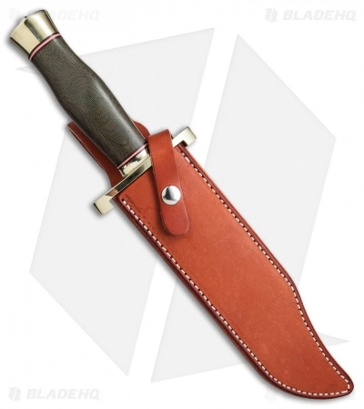 This BlackJack Model 129 is a substantial hunting fixed blade with a classic Bowie knife design. Its blade is made from durable A-2 steel with a convex grind and a satin finish. The handle features polished green Micarta with a comfortable palm swell, and comes paired with a brass pommel and guard. The Model 129 includes a genuine leather sheath with a loop for secure belt carry.