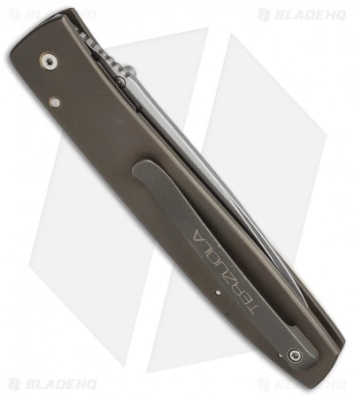 This sleek Bob Terzuola folder was recently acquired from a collection and is in excellent condition. It features a titanium liner lock frame with an authentic stag horn front scale. The polished blade is made from CPM-154 and comes in a drop point style. The knife includes a titanium pocket clip featuring a gold Terzuola engraving. A gold anodized back spacer adds a nice finishing touch to the design.