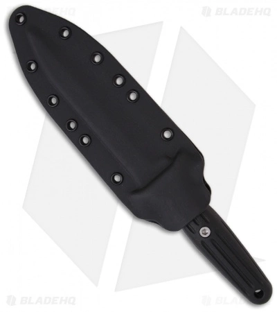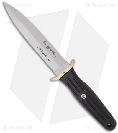 Boker’s re-issue of the Applegate-Fairbairn Fighting knife uses a fiberglass-reinforced Delrin handle that has been thickened in the center for a sure grip. A lanyard hole adds convenience. The handle meets a short, forward-bending cross guard that protects the fingers. Boker achieved the knife’s preferred rearward balance by inserting steel weights into the handle – a beautifully ergonomic design. The 6″ blade on this 10 3/4″ knife has effective reach, with a 1″ wide blade that’s beefy all the way to the tip. Struck of Solingen 440C stainless steel hardened to a Rockwell of 58, the blade has the signatures of Rex Applegate and W.E. Fairbairn etched into the bead-blasted finish. Kydex sheath with BladeTech belt clip.