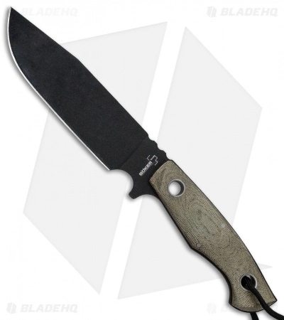 The Boker Plus Rold SK5 is a high performance fixed blade designed by Jesper Voxnaes to serve all of your camping and hiking knife needs. A .20″ full tang comes outfitted with green micarta scales for a super stable build. The blade is made from carbon steel with a durable black coating. Large tubular rivets reduce weight while providing a lanyard hole for accessorizing. Finger grooves and a jimped thumb rest offer multiple grip options for maximized security in hand. Red liners and a black lanyard cord finish off the excellent fixed blade design.