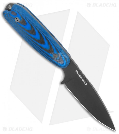 This Blade HQ Exclusive Bradford Guardian3 features a black DLC coated blade made of CPM-M4 steel and some textured black and blue G-10 handle scales.