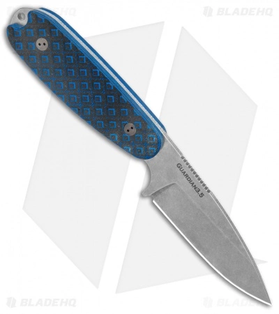 This Blade HQ Exclusive Bradford Guardian3 features a stonewash finished blade made of CPM-M4 steel and some textured black and blue handle scales.