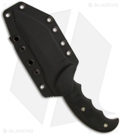 The Black Label Pandemonium fixed blade tactical knife has a 440 stainless steel blade that is bead blasted to a satin finish, with a hollow ground single edge in a trailing point shape. Rugged G-10 laminate scales with finger choils mount to the full tang construction with flush fasteners. The black Blade-Tech molded polymer belt sheath quickly adjusts to any angle and mounts easily on your belt, pack or web gear.