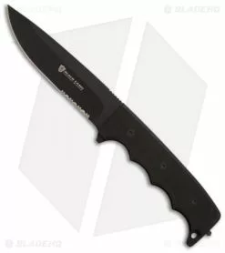The shark-like imposing Stone Cold features a hefty spear point blade crafted of matte black 440 stainless steel with a hollow grind, partial edge serrations, a pronounced front guard plus a squared pommel with a hardened glass breaking point. The finger-grooved handle is a full tang design and has black G10 scales. The matte black Blade-Tech molded polymer sheath allows you to position the Stone Cold at virtually any angle and mounts securely to your belt, web gear or tactical vest. Stone Cold means you’re ready for the heat of battle.