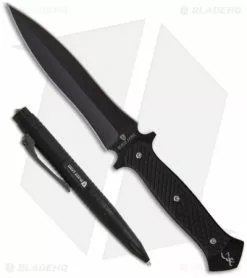 The Browning Black Label Tactical Pen and Letter Opener knife. The double-edge blade is black oxide finished. The full-tang blade is chisel ground and flat on the back side. The handle has a single G-10 scale. The knife includes a sheath with holes for lashing to gear. The tactical defense pen has an aluminum body with a stainless pocket clip and a glass breaker tip. The pen tip is retractable with the twist top. Measures 5 inches overall.