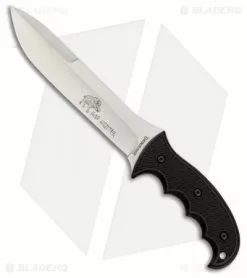 - Stainless steel, spear point blade has a satin finish and a hog blade etch.