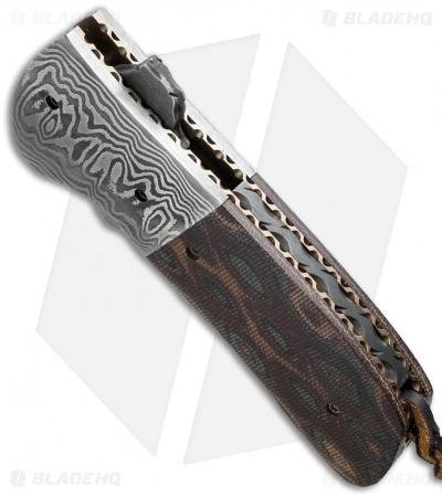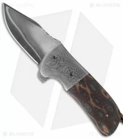 The Coffin Nail Flipper is an exceptional handmade folding knife from Mark Nevling’s Burr Oak Knives. It has a San Mai 416/52100 Damascus steel clip point blade with an oversized flipper opener. The titanium liner lock handle is outfitted with 150 layer random Damascus bolsters, snakeskin canvas Micarta scales, and a heat colored pocket clip. The liners and steel backspacer are fileworked. This knife comes with a signed certificate of authenticity, dated 7/28/15.