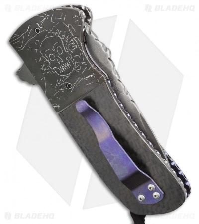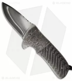 Here’s the Coffin Nail Drop Point, an exceptional handmade folding knife from Burr Oak Knives. It has a San Mai 416/52100 steel drop point blade with an oversized flipper opener. The titanium liner lock handle is outfitted with mosaic skull Damascus bolsters, carbon fiber scales and an anodized pocket clip. The blade, liners, and steel backspacer are fileworked. This knife comes with a signed certificate of authenticity, dated 6/5/15.