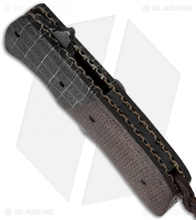 The Harpoon Flipper knife features a 416/52100 San Mai Damascus steel blade with a flipper opener. It has a brown burlap Micarta handle with “Jelly Roll” mosaic Damascus bolsters over bronzed titanium liners, with lock tab. The steel back spacer is filed, along with the liners and blade spine. This knife comes with a signed certificate of authenticity, dated 2/29/15.