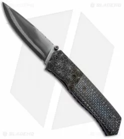This Splinter folder has a 416/52100 San Mai Damascus steel drop point blade. The blade opens with the thumb stud opener on front and the back side is stamped “Burr Oak Nevling”. The handle features Tesla Mosaic Damascus bolsters and carbon fiber scales with a metallic blue weave. Filed titanium liners, steel back spacer, and blade spine. This knife comes with a signed certificate of authenticity, dated 11/21/13.