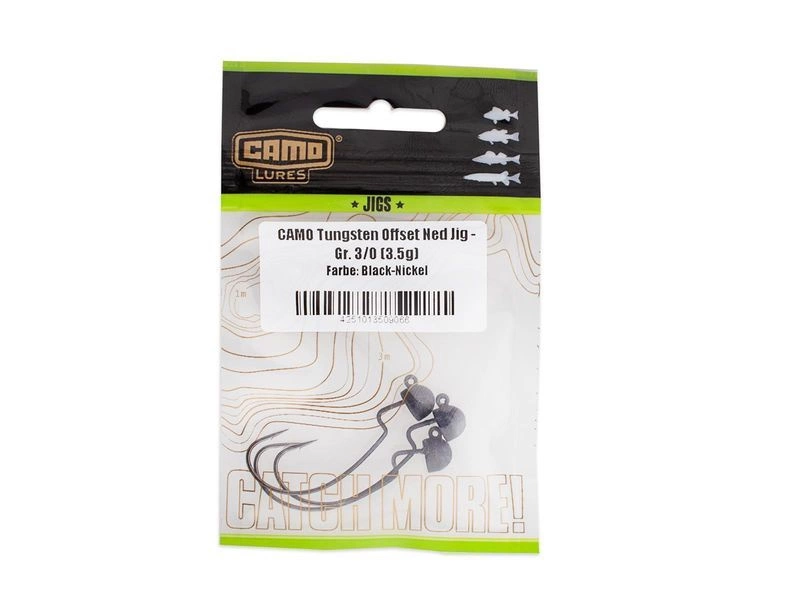 Sienenmuotoinen pää auttaa vieheitä nousemaan pystyyn Ned Rigin kanssa kalastettaessa. Offset Ned Jig on monipuolinen ja toimii hyvin muiden tekniikoiden kanssa. Volframin tiheys on suurempi kuin lyijyn. Siksi jigit osoittautuvat pienemmiksi kuin perinteiset lyijypäät samalla painolla. Volframi on myös ympäristöystävällistä. Kaikille Camo-jigeille on ominaista huolellinen työstö ja laadukkaat, neulakärkiset koukut.