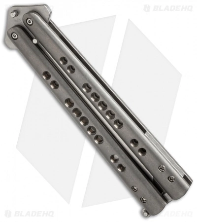 Balisong #141 has drilled and tumbled titanium handles with bronze bushing pivot and washers. The clip point style blade has a stonewash finish. The #141 Balisong has excellent action and build quality!