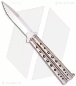 The Chuck Gedraitis Balisong #61 has drilled titanium handles with blue anodized chamfer accents. Zen pins and stainless spacers. All surfaces are satin finished. The blade is 154-CM stainless steel and weehawk patterned. This butterfly knife doesn’t have bushings, but flips great.