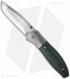 This Modified Tanto folder features a 1095 steel blade with a Hamon finish. The blade bevels are flat ground with a tanto style tip and a false edge that starts about 5/16″ back from the tip, which leaves the tip thicker for strength. The thumb stud has a green G10 inlay. The handle has a Dan Seaver Turkish Twist Damascus steel bolster and polished green G-10 scales. The titanium liner lock frame is supported with two standoffs. The pocket clip is textured titanium.