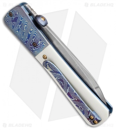 This San Francisco Style Folder has a singular presence that will captivate knife collectors. It has a 1095 steel blade with a Hamon finish and Moku-Ti thumb disc. Polished white G-10 scales along with Moku-Ti bolsters and pocket clip add class and visual spice to the bow tie shaped handle. The titanium liner lock frame is blue anodized and engine-turned. In addition to it’s fine materials, this knife has the build-quality and refinement that a discerning collector will appreciate.