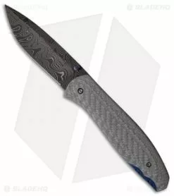 This Model 1 folder from Chuck Gedraitis has a silver twill carbon fiber handle with titanium liners, lock, clip, and thumb stud. The liners are blue anodized and provide a great contrast to the scales and blade. Chad Nichols “Boomerang” Damascus steel blade with thumb stud opener.
