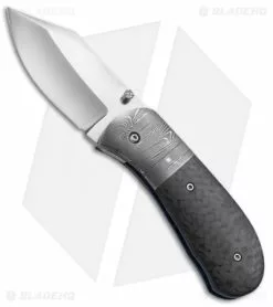 This custom Small Puffin folder is finely outfitted with Larry Donnely mosaic Damascus bolsters and polished carbon fiber scales. The titanium liners are finely textured and blue anodized, giving it additional additional visual “pop.” Its hollow ground, satin finished clip point blade has a thumb stud for one-hand opening.