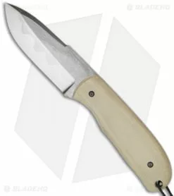 This Snubnose fixed blade has a W-2 steel blade with a Hamon finish. The handle is slim and comfortable with contoured tan G-10 scales. The Snubnose includes a fitted gray Kydex sheath with a 1-1/4″ wide belt loop for right-hand carry.