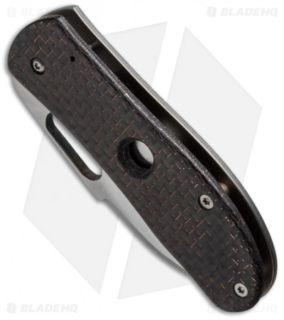 This custom Snubnose Hybrid is a seriously classy frame lock folder. Its blade is made from satin finished CPM-154 stainless steel with an elongated thumb hole. The handle features a lightning strike carbon fiber front scale and a textured titanium frame lock with matching milled pocket clip. Blade deployment is smooth and lockup is nice and tight.