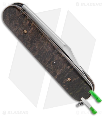 The Chuck Gedraitis Swiss Army Switchblade Automatic Knife is all the name implies and more! Simply slide back the front handle scale with the “G.” The scale will pivot slightly before releasing the blade. Once opened, the blade is held in place with a liner lock. This knife is equipped with some of the best materials on the market: titanium liners and spring and a CPM 154 blade for ease of sharpening and long edge retention. The Swiss Army Switchblade Automatic Knife is small and simple yet unique and exciting, all while maintaining its functionality and clean, classic look. It features a removable toothpick and tweezers that are concealed within the scales. A lanyard ring is also provided for customizing and EDC.