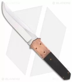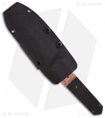 This is the fixed blade version of the Yakuza. It features a bronze bolstered handle with an antique patina and black textured G10 scales. The screws have been heat colored bronze. The multi-bevel ground blade is 154-CM steel with a hand satin finish and textured ricasso area and spine. The main bevel is hollow ground, the tip is convex and the false edge is flat. The handle is slim and comfortable. The Yakuza includes a fitted Kydex sheath with a 1-1/2″ wide belt loop.