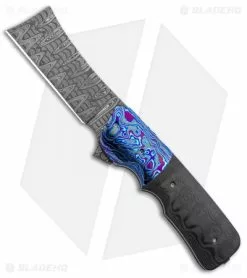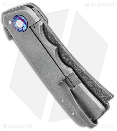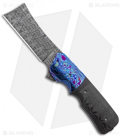 This custom Jason Clark Tiny Spanish Tip features ladder pattern Damascus, titanium frames, a fat carbon fiber handle scale, and Timascus bolster and pivot collars. Titanium pocket clip. One of a kind.