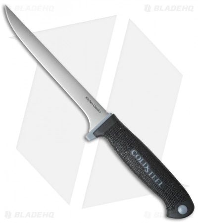 This model has a 6″ fillet knife blade. The Cold Steel Kitchen Classics series feature high performance ice tempered, cryo-quenched and precision flat ground 400 series steel blades for exceptional cutting performance. All models in the series come with a razor sharp edge that lasts and lasts, and some have serrated edges uniquely appropriate to the tasks they were designed to do.