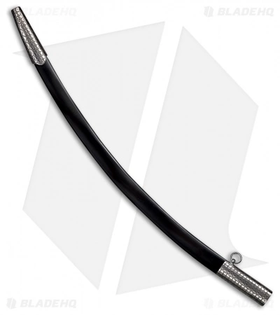 - Black leather scabbard with etched steel throat, chape, and carrying rings.
