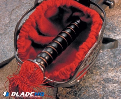 - Leather covered wood scabbard provides a safe storage option.