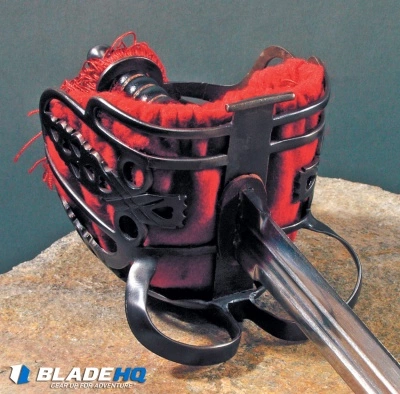- Blued steel basket leather scabbard with blued steel fittings.