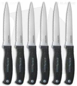 Cold Steel’s Kitchen Classics Steak Knives have flat ground 400 series steel blades with a fully serrated edge. The handles have been re-engineered to ensure proper grip and feel in hand, with a stiff core and Kray-Ex exterior. This is a set of six steak knives.