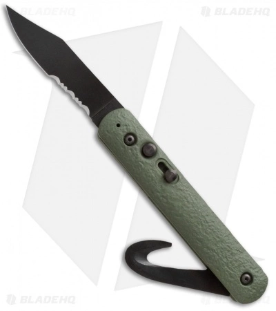 Automatic Rescue/Parachute Knife by Colonial Knife Company. The M-724 features a rescue hook and automatic blade. It is made for use in emergency survival conditions. The M-724 consists of a hook belt cutter blade on one end and an automatic blade on the other end. The blade is opened by a release button and held in place with a slide lock. The steel is black finished 1095 HC serrated and the handle is Combat green DOW ISOPLAST with sliding safety and pocket clip.