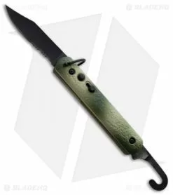 Automatic Rescue/Parachute Knife by Colonial Knife Company. The M-724 features a rescue hook and an automatic blade with a partially serrated edge. It is made for use in emergency survival conditions. The M-724 consists of a hook belt cutter blade on one end and an automatic blade on the other end. The blade is opened by a release button and held in place with a slide lock while the rescue hook has a nail nick for opening. The steel is 1095 HC and the handle is black ISOPLAST with sliding safety.