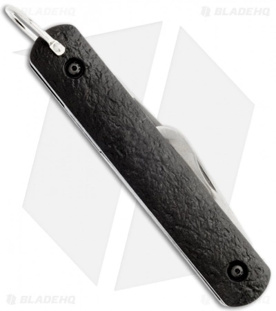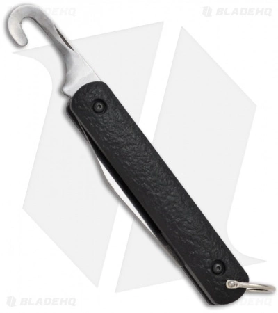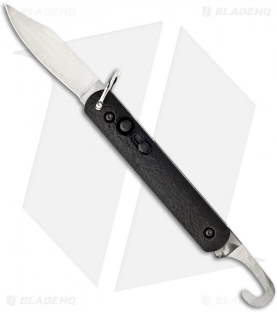 Automatic Rescue/Parachute Knife by Colonial Knife Company. The M-724 features a rescue hook and an automatic blade with a plain edge. It is made for use in emergency survival conditions. The M-724 consists of a hook belt cutter blade on one end and an automatic blade on the other end. The blade is opened by a release button and held in place with a slide lock while the rescue hook has a nail nick for opening. The steel is 1095 HC and the handle is black ISOPLAST with sliding safety and bail loop.
