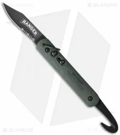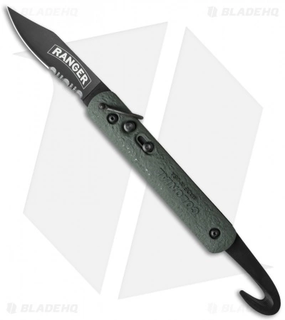 Colonial Knife’s Ranger Combat knife offers both a belt cutter hook and a serrated clip point blade for handling those most challenging cutting tasks. The blades are made of high carbon 1075 steel with a black oxide finish. The handle is a lightly textured molded isoplast with an OD green finish. The belt hook is a manual release and opens easily. There is a push button release for the clip point blade, which opens fast and locks up securely. The push button also releases the blade when you’re ready to fold it away. There is a sliding safety to protect against the accidental discharge of the blade, and a metal bail for attaching the knife to your belt or gear.